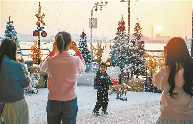 市民在途紀·落日碼頭的人造雪景中拍照。